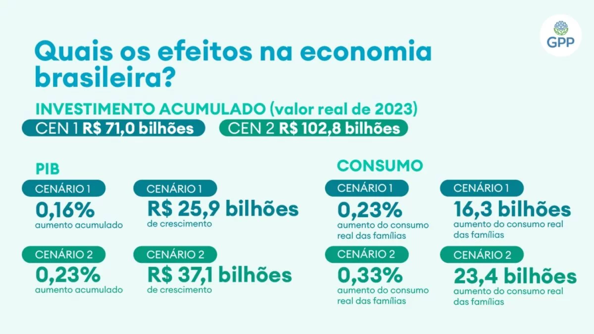 Com isso, os pesquisadores traçaram os efeitos desses crescimentos na economia brasileira. No primeiro cenário, o PIB aumentaria em R$ 25,9 bilhões (0,16%). Já no segundo, o crescimento seria de R$ 37,1 bilhões (0,23%). A princípio, o número pode parecer baixo, mas colocado em perspectiva, é um impacto maior do que outras políticas, como o Plano Nacional de Energia 2030 (+0,033% sobre o PIB) e disponibilidade de crédito rural analisado de 1999 a 2018 (+0,2% sobre o PIB).