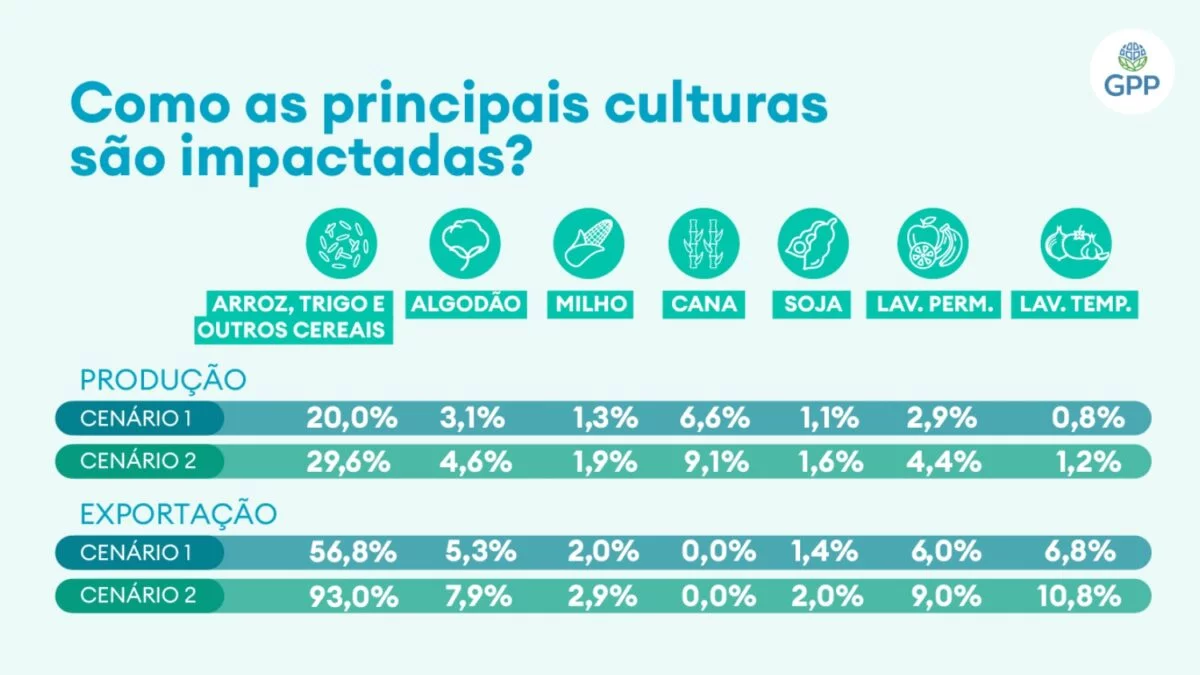O arroz pode ter um acréscimo de produção de 29,6% no panorama mais otimista, enquanto a cana pode render mais 9,1%. Algodão e lavouras permanentes, como de laranja e banana, podem ter um incremento acima de 4% (ver quadro abaixo). As exportações também podem subir com o crescimento da produção desses alimentos.