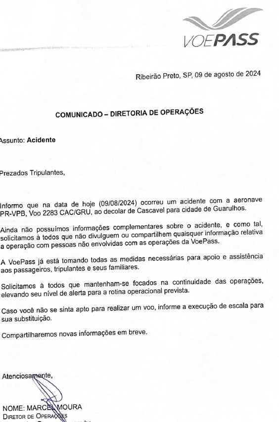Ainda não possuímos informações complementares sobre o acidente, e como tal, solicitamos à todos que não divulguem ou compartilhem quaisquer informação relativa a operação com pessoas não envolvidas com as operações da VoePass. A VoePass já está tomando todas as medidas necessárias para apoio e assistência aos passageiros, tripulantes e seus familiares. Solicitamos à todos que mantenham-se focados na continuidade das operações, elevando seu nível de alerta para a rotina operacional prevista. Caso você não se sinta apto para realizar um voo, informe a execução de escala para sua substituição. Compartilharemos novas informações em breve.