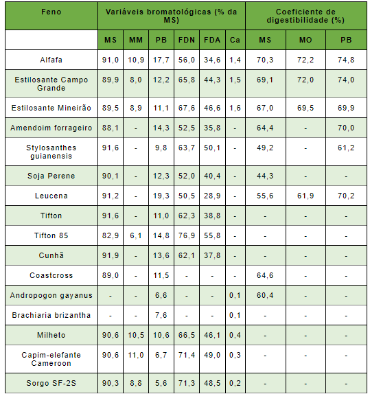 Tabela 1. Composição bromatológica, base na matéria seca, dos fenos de algumas forrageiras.