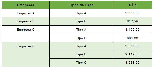 Tabela 3. Preços médios de feno (R$/t) em São Paulo.