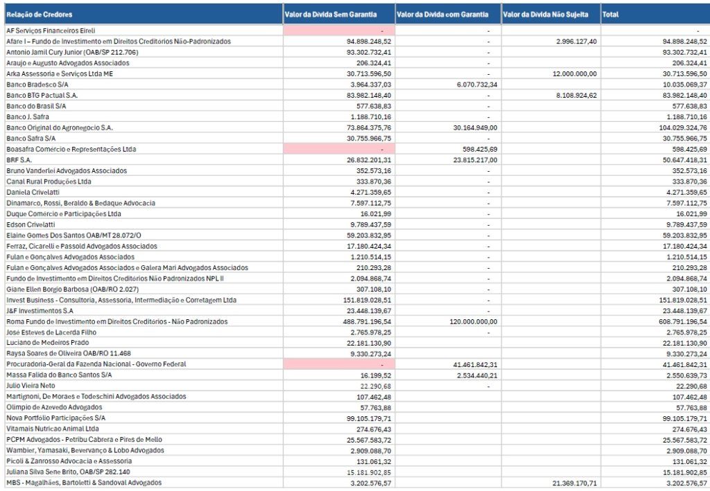 O grupo acumula outras dívidas significativas, incluindo R$ 93 milhões com o advogado paulista Antonio Jamil Cury Junior e R$ 59 milhões com a jurista mato-grossense Elaine Gomes dos Santos. Grandes instituições financeiras também estão entre os credores, como o Banco BTG Pactual (R$ 83 milhões), Banco Original do Agronegócio (R$ 104 milhões) e Banco Safra (R$ 30 milhões).