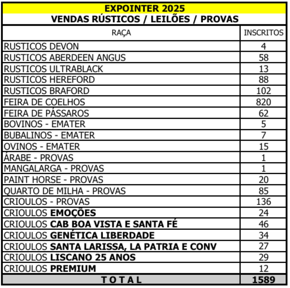 Com o encerramento das inscrições de animais rústicos para a 48ª Expointer, a edição deste ano da feira contará com um total de 6.696 animais. São 1.589 animais rústicos, que participam de julgamentos, vendas, leilões ou provas, e 5.107 animais de argola, que vão a julgamento morfológico nesta modalidade. As inscrições de rústicos tiveram um aumento de 18,2% em relação ao ano passado.