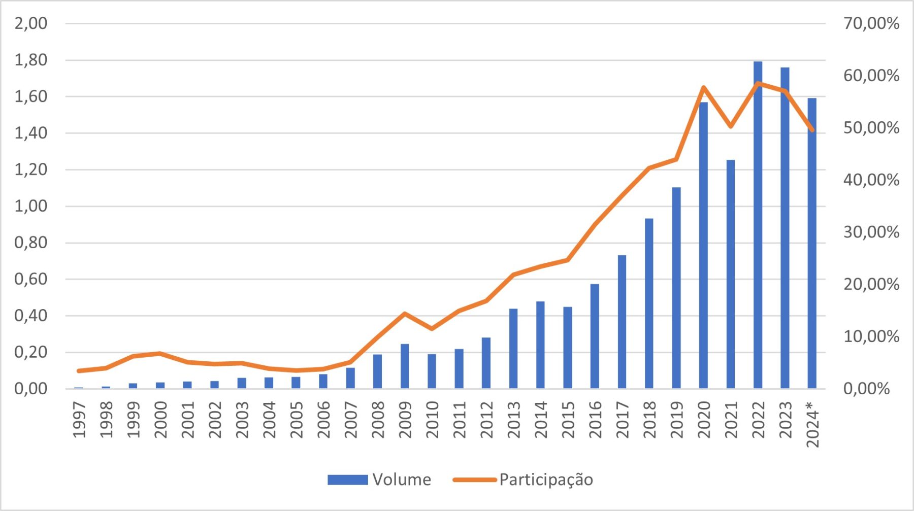 A participação está em 7,9%, são 41,77 pontos percentuais abaixo da China. A participação dobrou em relação a 2020. Em 2020, era de 3,6%.