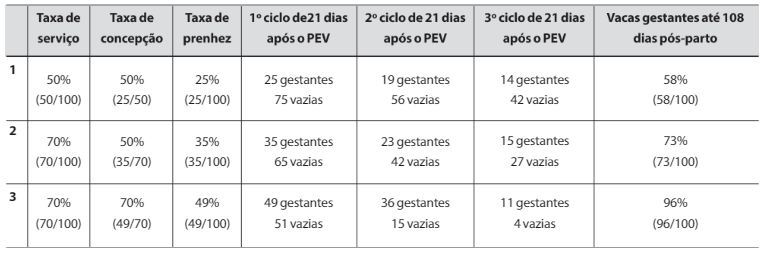 Tabela 1. Evolução do desempenho reprodutivo de três propriedades hipotéticas (1, 2, 3), considerando a presença de 100 vacas aptas após período de espera voluntário (PEV) de 45 dias.