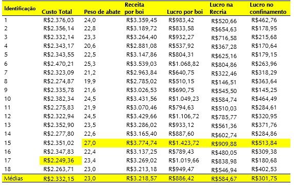 Tabela 5. Custo total, peso de abate em arrobas, receita por boi, lucro por boi, lucro na fase de recria e lucro no confinamento.