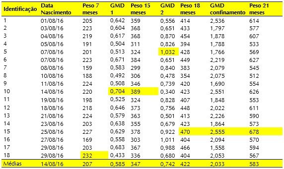 Em amarelo estão marcados os melhores valores para cada característica. Por exemplo, o touro 18 apresentou o melhor peso aos 7 meses com 232 kg; o touro 10 apresentou o maior ganho de peso dos 7 aos 15 meses e maior peso aos 15 meses, com 0,704 kg/dia e 389 kg, respectivamente; o touro 5 apresentou o melhor ganho de peso dos 15 aos 18 meses, como 1,032 kg/dia; e o touro 15 foi o mais pesado aos 18 meses, apresentou o maior ganho de peso no confinamento, 2,555 kg/dia e consequentemente o maio peso aos 21 meses, 678 kg.