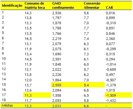 Os 18 animais consumiram em média 13,3 kg/dia de matéria seca, ganharam 2,033 kg/dia de peso, o que resultou em uma conversão alimentar de 6,6 kg de matéria seca para cada 1 kg de ganho de peso. Além disso, apresentamos o CAR (Consumo Alimentar Residual) que mostra se o animal comeu mais ou menos do que o que estava previsto em função do ganho de peso que ele apresentou. Animais com valores negativos são os melhores, como foi o caso do animal 17, que apresentou o menor consumo de matéria seca, 11,3 kg/dia e o CAR mais negativo, consumindo -1,509 kg/dia de matéria seca para um ganho médio diário de 1,558 kg/dia, infelizmente o pior desempenho do grupo.