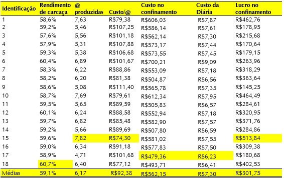 Na tabela 4, temos informações que determinam a produtividade de cada animal em função do rendimento de carcaça estimado por uma fórmula que utiliza o peso vivo, a área de olho de lombo (AOL) e a espessura de gordura subcutânea. Quanto maiores o peso vivo e a AOL e menor a espessura de gordura, maior é o rendimento de carcaça previsto. Com isso temos as arrobas (@) produzidas por cada animal no confinamento, que depende do rendimento e do ganho médio diário. Na quarta coluna temos o custo por @ produzida, que é função da quantidade de alimento consumido durante o confinamento, em que consideramos um custo de R$ 0,55 por kg de matéria seca durante 77 dias. Esse valor que é o da quinta coluna, é dividido pelas arrobas produzidas, gerando o custo por arroba. Na sexta coluna está o valor da diária no confinamento, que é o consumo médio diário de matéria seca multiplicado pelo custo de R$ 0,55. E na última coluna, temos o lucro por animal no confinamento, onde consideramos um valor de R$140,00 por cada arroba vendida. Os valores em amarelo são os melhores para cada item, e aqui identificamos que o animal mais lucrativo, foi o 15, que produziu mais arrobas, 7,82, com o menor custo por arroba, R$74,30. O que gerou um lucro de R$513,84 no confinamento, contra um lucro quase quatro vezes menor do animal 9 com R$145,25!