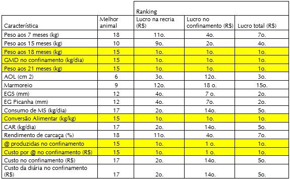 Para concluir, são apresentados na tabela 6 os líderes para cada característica medida e como eles se posicionaram para o que realmente importa, que são os lucros: na fase de recria, na terminação no confinamento e durante todo o período até o abate, que é o lucro total. Desta maneira conseguimos visualizar quais características apresentadas pelos animais foram impactantes no lucro.