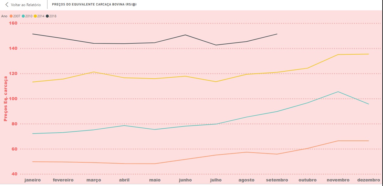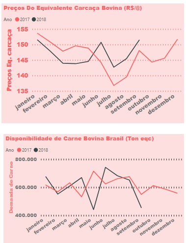 Ou seja, raramente temos anos tão bons de exportações como 2018 e mesmo assim os preços máximos do ano superaram muito pouco as máximas de 2017. No Gráfico 1, podemos verificar que a disponibilidade de carne no mercado interno tem sido muito similar a de 2017 e os preços da carne (equivalente carcaça), subiram muito pouco. Em setembro estimamos que disponibilizamos menos carne ao mercado interno que 2017 e os preços reagiram de forma muito tímida.