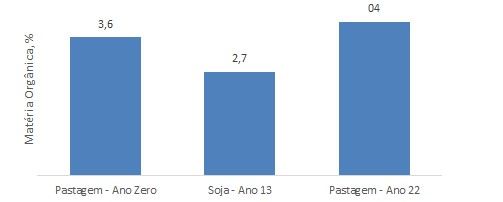 Figura 2. Alteração no conteúdo de carbono (C) no solo (como matéria orgânica) na sucessão de pastagem-soja-pastagem. A soja foi cultivada por 13 anos e reduziu o C no solo. Após nove anos de cobertura com pastagem, o C no solo voltou a subir, terminando com um valor maior do que o original. (Fonte: adaptado de Sousa et al., 1997)²