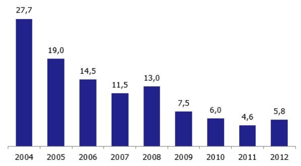 Figura 1. Redução do desmatamento na Amazônia entre 2004 e 2012, período em que a região teve significativo aumento de rebanho. Entre 2006 e 2015 os estados do Mato Grosso, Pará e Rondônia que fazem parte do bioma amazônico tiveram aumento de 9,18%, 6,38% e 11,40% respectivamente. Nos últimos anos, o desmatamento voltou a subir e tem oscilado entre 6 a 7 mil hectares por ano.