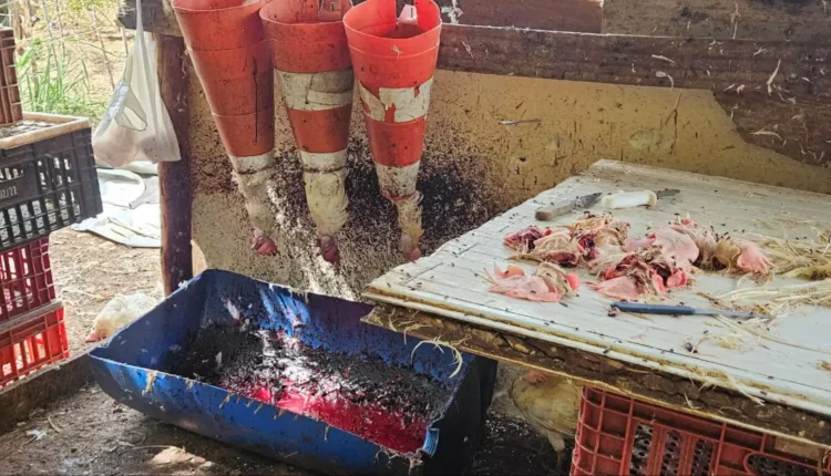 Havia pedaços das aves em cima de uma espécie de balcão, com sujeiras e moscas. Não havia, no local, um espaço adequado para descarte de restos dos animais abatidos. No abatedouro clandestino, estavam duas pessoas, mas um dos homens fugiu para o meio do matagal, ao ver a viatura policial.