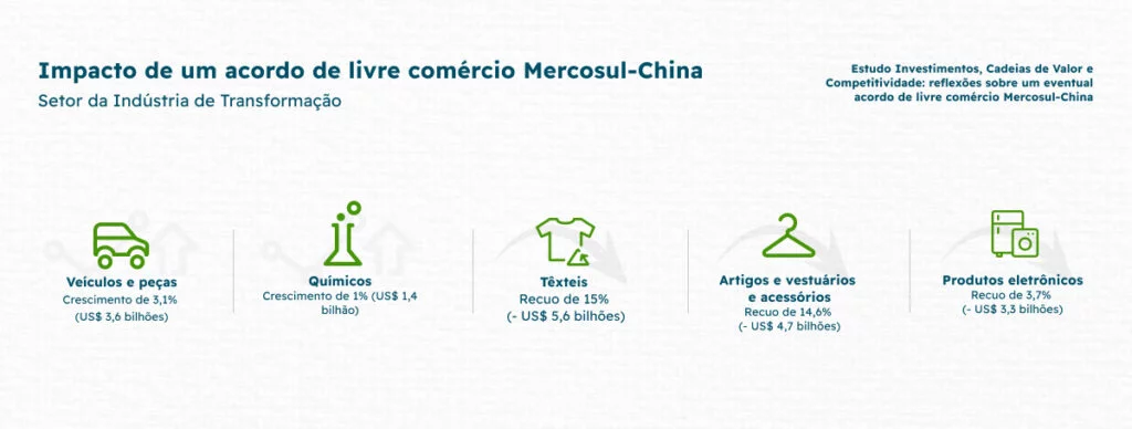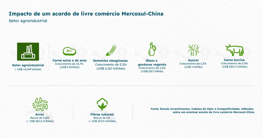 Uma pesquisa do Instituto de Pesquisa Econômica Aplicada (Ipea) e do Conselho Empresarial Brasil-China (CEBC) calculou cenários em um eventual acordo de livre comércio Mercosul-China. O setor mais beneficiado seria o da agropecuária, com um incremento de US$ 14,6 bilhões nas negociações com o país asiático entre 2024 e 2035.
