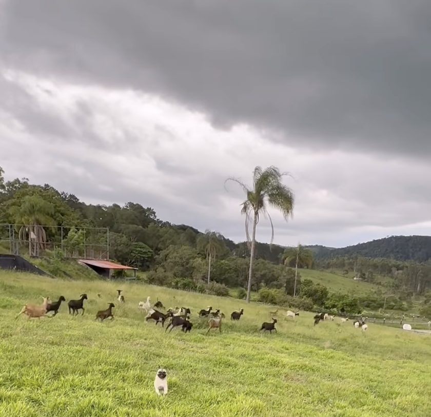 As imagens do pequeno pug correndo atrás das ovelhas, acompanhando o quadriciclo e explorando o pasto rapidamente despertaram a curiosidade do público.