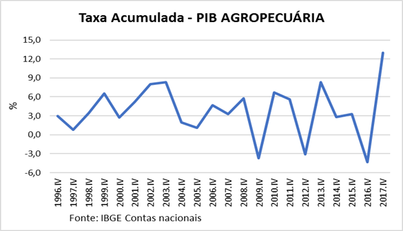 A agropecuária foi o setor com melhor desempenho na economia em 2017, se destacando com alta de 13%, enquanto a indústria ficou estagnada e serviços tiveram recuperação moderada (0,3%).