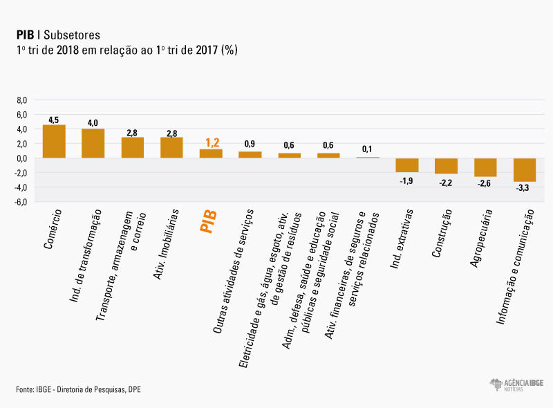 O Produto Interno Bruto (PIB) cresceu 1,2% no primeiro trimestre de 2018, na comparação com o mesmo período do ano passado, com queda de 2,6% na agropecuária. Indústria e serviços cresceram, respectivamente, 1,6% e 1,5%, puxados pela indústria de transformação, transporte de carga e comércio atacadista.