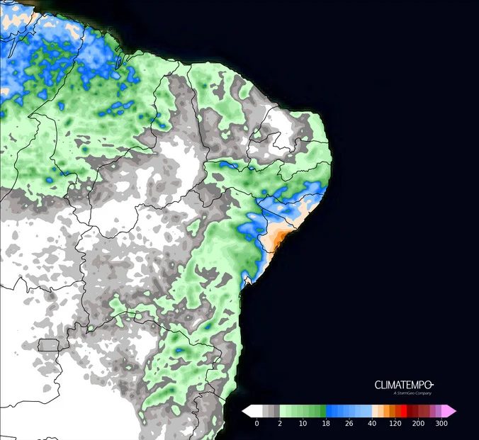 Já no litoral nordestino, a mesma frente fria contribui para o aumento da instabilidade, com chuvas acima da média, especialmente em Sergipe, Bahia e Alagoas.