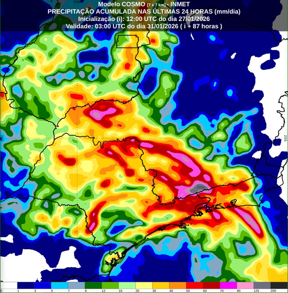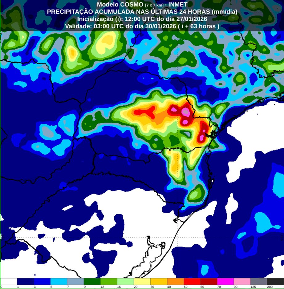 A partir de quinta-feira (29), a passagem da frente fria deve intensificar as instabilidades no Paraná e em Santa Catarina. As áreas com maior risco de tempestades incluem a Região Metropolitana de Curitiba, o Norte Catarinense, o Vale do Itajaí e a Região Serrana de Santa Catarina. Nesses locais, o INMET projeta chuvas volumosas, acompanhadas de ventos fortes, descargas elétricas e possibilidade de granizo, com acumulados de até 100 mm em apenas 24 horas .