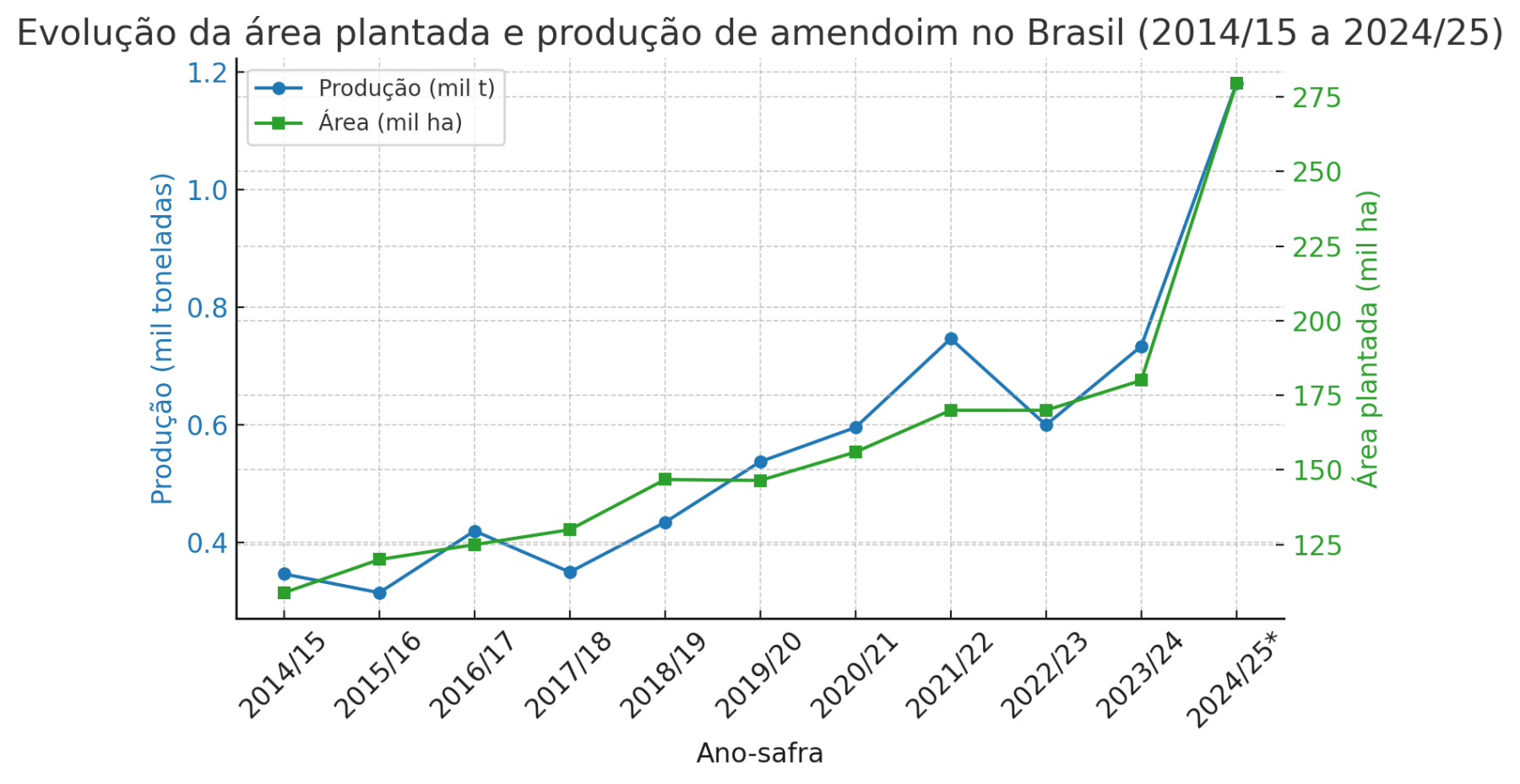 Nos últimos dez anos, a produção brasileira de amendoim mais que triplicou, passando de 346,8 mil toneladas na safra 2014/15 para 733,7 mil toneladas em 2023/24. Segundo a Companhia Nacional de Abastecimento (Conab), projeta-se uma produção recorde de mais de 1,18 milhão de toneladas na safra 2024/25, um aumento de 60,3% em relação à safra anterior.