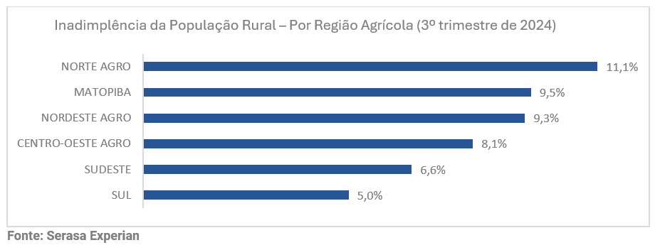 De acordo com os dados, a região “Norte Agro” – que abrange a região Norte do Brasil com exceção de Rondônia e Tocantins, além de incluir o Noroeste de Maranhão – registrou o maior índice de inadimplência no terceiro trimestre de 2024, marcando 11,1%. Por outro lado, a região Sul teve o menor percentual, de 5,0%.