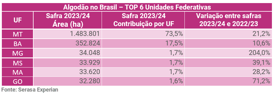 Os dados inéditos mapeados pela Serasa Experian revelaram quais Unidades Federativas (UF) concentraram a maior parte da produção. O destaque fica para Mato Grosso que foi responsável por 73,5% do plantio de algodão no país. Em seguida estava a Bahia, com 17,5% e Minas Gerais, com 1,7% Confira as informações sobre as top 6 UFs na tabela a seguir: