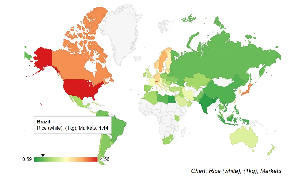 O levantamento apresentado pela Federação dos Arrozeiros do Rio Grande do Sul (Federarroz) mostra que o Brasil ocupa a 83ª posição entre 96 países, de acordo com o preço cobrado pelo arroz. O produto brasileiro é mais barato, por exemplo, que o arroz da Tailândia (78º), da Argentina (75º), do México (62º), de Cuba (37º) e dos Estados Unidos (1º), o país com o maior preço praticado. Enquanto nos EUA, o quilo do arroz está sendo vendido a US$ 4,56 nesta quarta, 28, no Brasil o preço era de US$ 1,14.