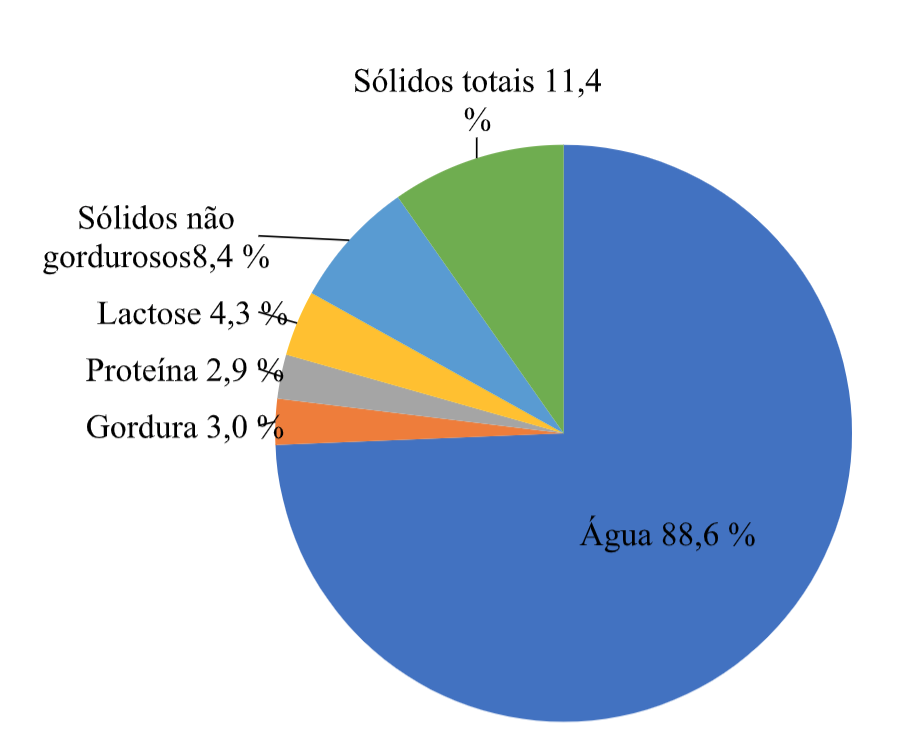 A composição do leite é variável de acordo com vários aspectos como genética do animal, estado nutricional, fase de lactação, ordem de parição, estação do ano, região e condição em que esses animais são criados. A Figura 1 apresenta os valores da composição do leite conforme recomendações do Ministério da Agricultura, Pecuária e Abastecimento.