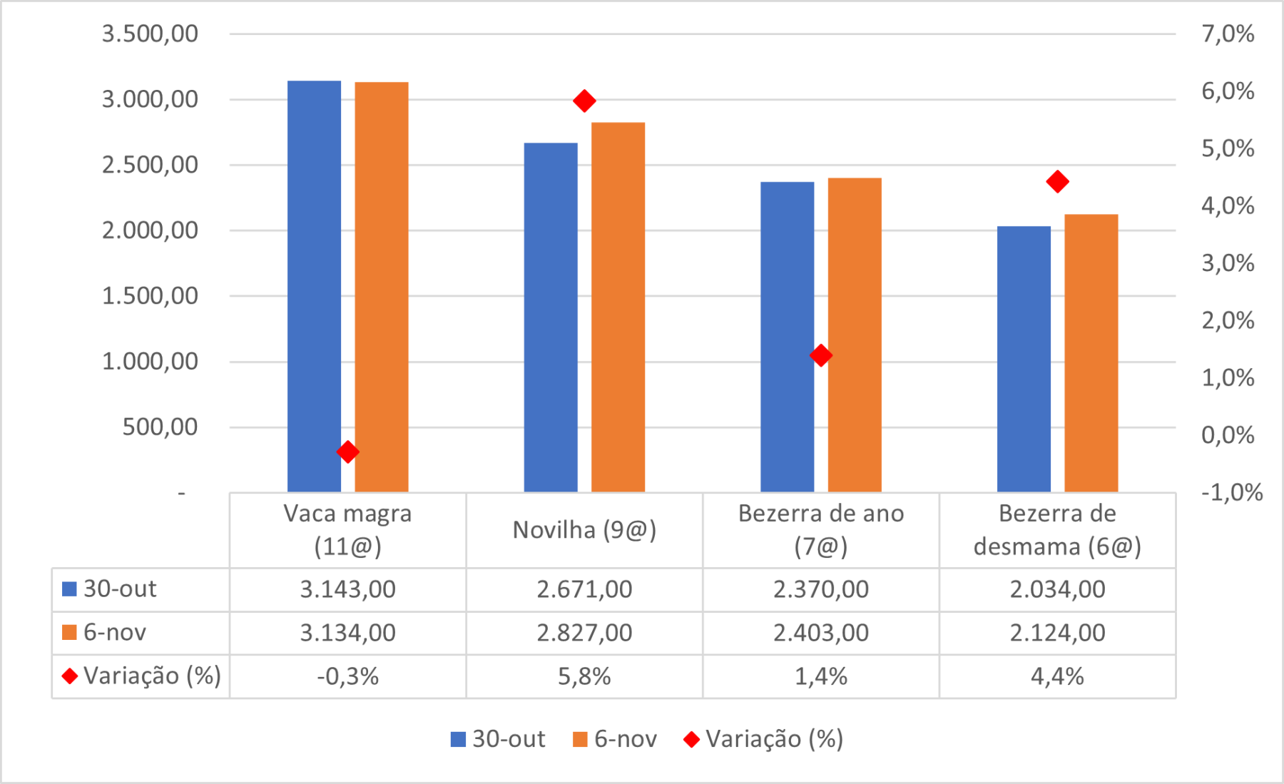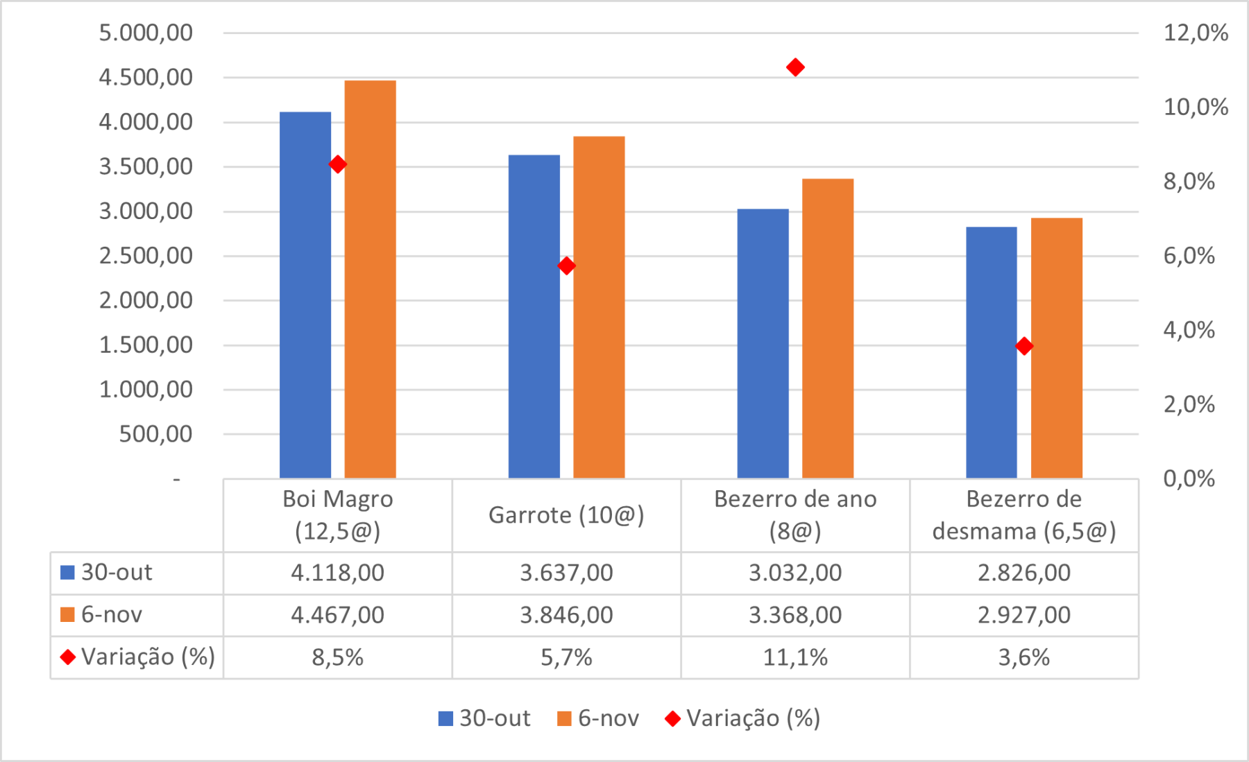 A cotação do bezerro de ano está nos maiores patamares do ano, com negócios entre R$379,00/@ em 30/10 e R$421,00/@ em 6/10. No mesmo intervalo, o boi magro foi cotado entre R$329,44/@ e R$357,36/@, considerando as médias semanais.