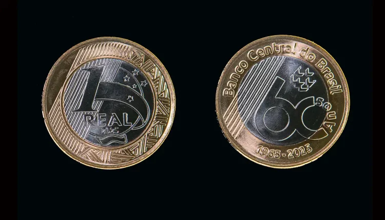 A edição especial tem duas principais diferenças em relação às moedas atuais de R$ 1. No anverso (frente), a peça apresenta, em destaque, o selo comemorativo dos 60 anos do BC, acompanhado da marca da autoridade monetária e de linhas diagonais. Tradicionalmente, o anverso exibe a efígie da República.