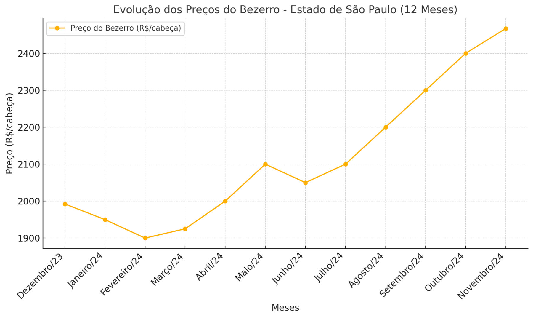O gráfico abaixo retrata a evolução dos preços médios do bezerro no estado de São Paulo ao longo de 12 meses, evidenciando uma valorização significativa no período. Em dezembro de 2023, o preço médio por bezerro era de R$ 1.992,24, enquanto em novembro de 2024 alcançou o patamar de R$ 2.467,00, representando uma alta de aproximadamente 23,8%. Essa escalada reflete o impacto da recuperação das pastagens, o aumento da demanda por reposição e a oferta restrita, consolidando o bezerro como um dos ativos mais valorizados do mercado pecuário no último ano.