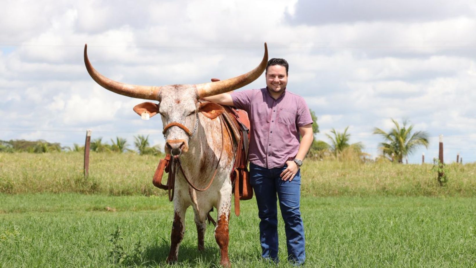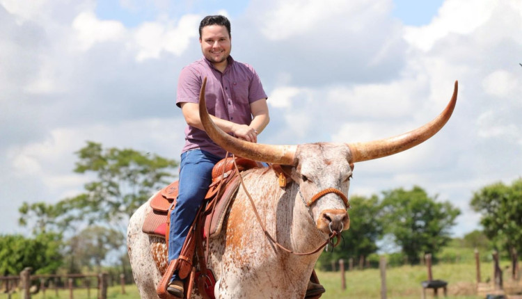 “É um boi Texas Longhorn de apenas três anos e meio, nascido em agosto de 2022, que só completa quatro anos em agosto de 2026. Já apresenta quase dois metros de chifre, uma coloração diferenciada e um temperamento extremamente dócil. É um boi de sela, que pode ser usado em cavalgadas e passeios, funcionando praticamente como um cavalo. Um diferencial único dentro da raça”, destaca.