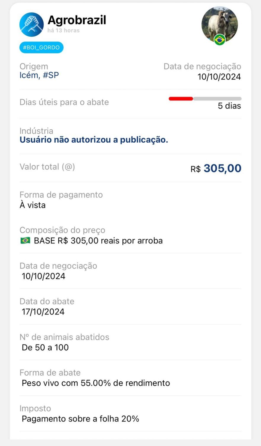 Segundo informações do Agrobrazil, uma das melhores negociações do dia foi registrada na cidade de Icém, São Paulo, onde a arroba do boi foi comercializada a R$ 305,00, conforme reportado por pecuaristas. O pagamento foi realizado à vista, com abate programado para 17 de outubro de 2024. A negociação envolveu entre 50 a 100 animais, com rendimento de 55% e imposto sobre a folha de 20%. Esse valor foi superior ao observado no indicador Cepea/B3, que registrou o preço da arroba em R$ 294,50 no mesmo dia.