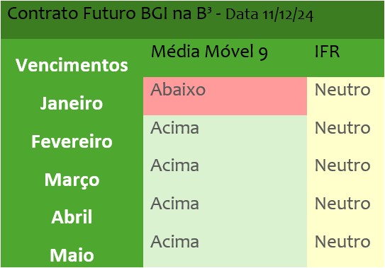 Como podemos observar, temos boa parte dos contratos acima da média móvel (isso é bom) e o IFR (Índice de Força Relativa) em cenário neutro. Vale lembrar que até na quinta-feira passada (5/12) os contratos estavam negociando abaixo da média móvel de preços, mas com o IFR em “zona de sobrevenda”, indicando que aquele cenário poderia ter mudanças.