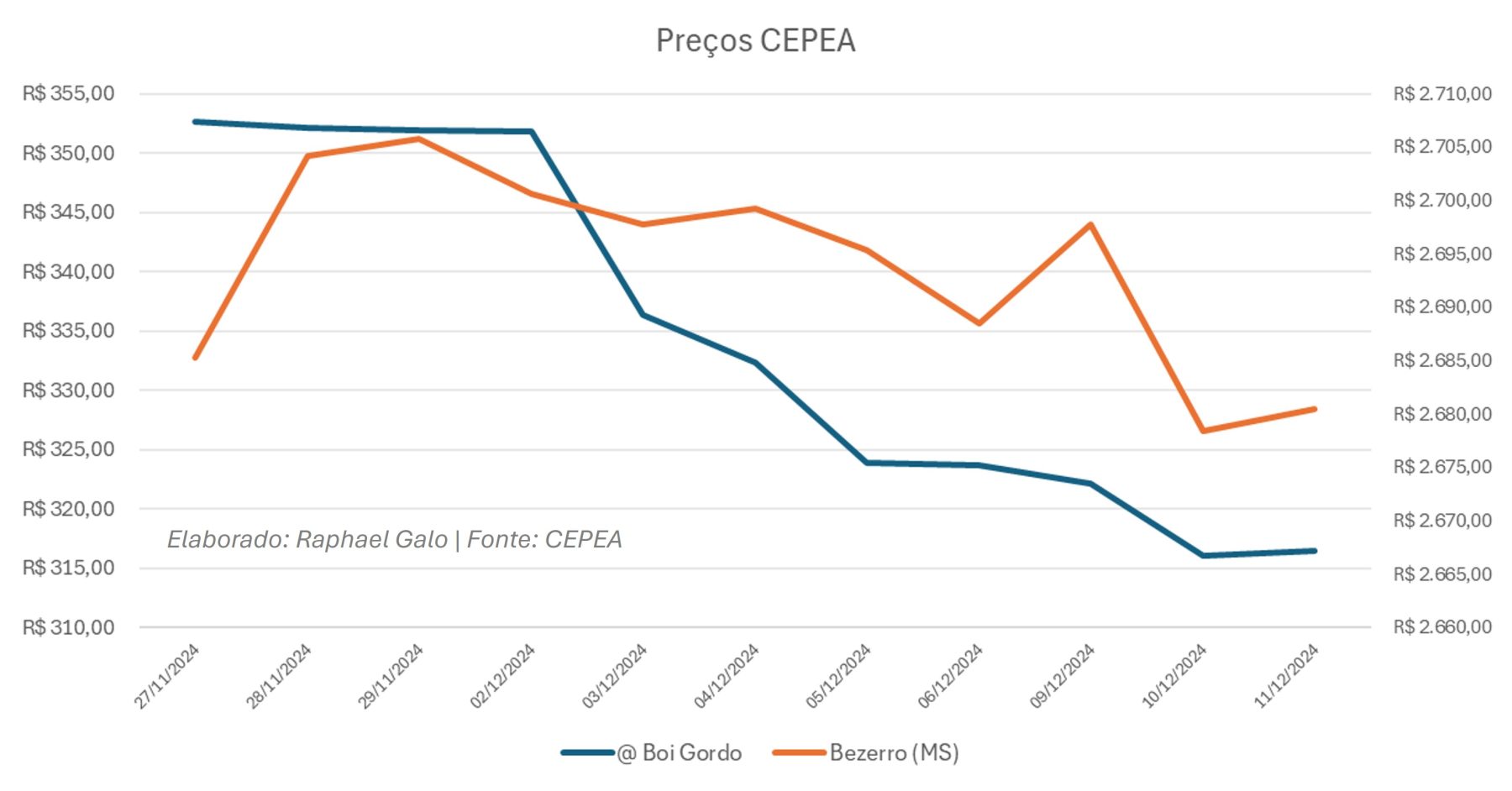 Preços da arroba do boi gordo, eixo da esquerda, e do bezerro, eixo da direita.