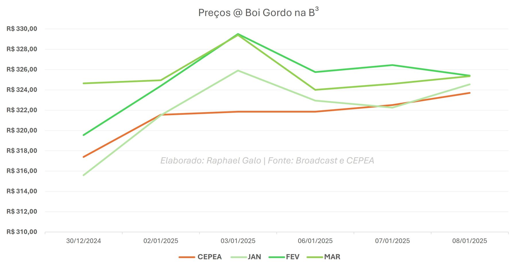 Preços da arroba do boi gordo na B3, para os contratos de janeiro, fevereiro e março de 2025.