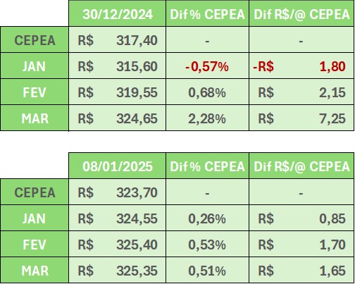 Comparação dos contratos futuros entre os dias de 30/12/2024 e 8/1/2025.