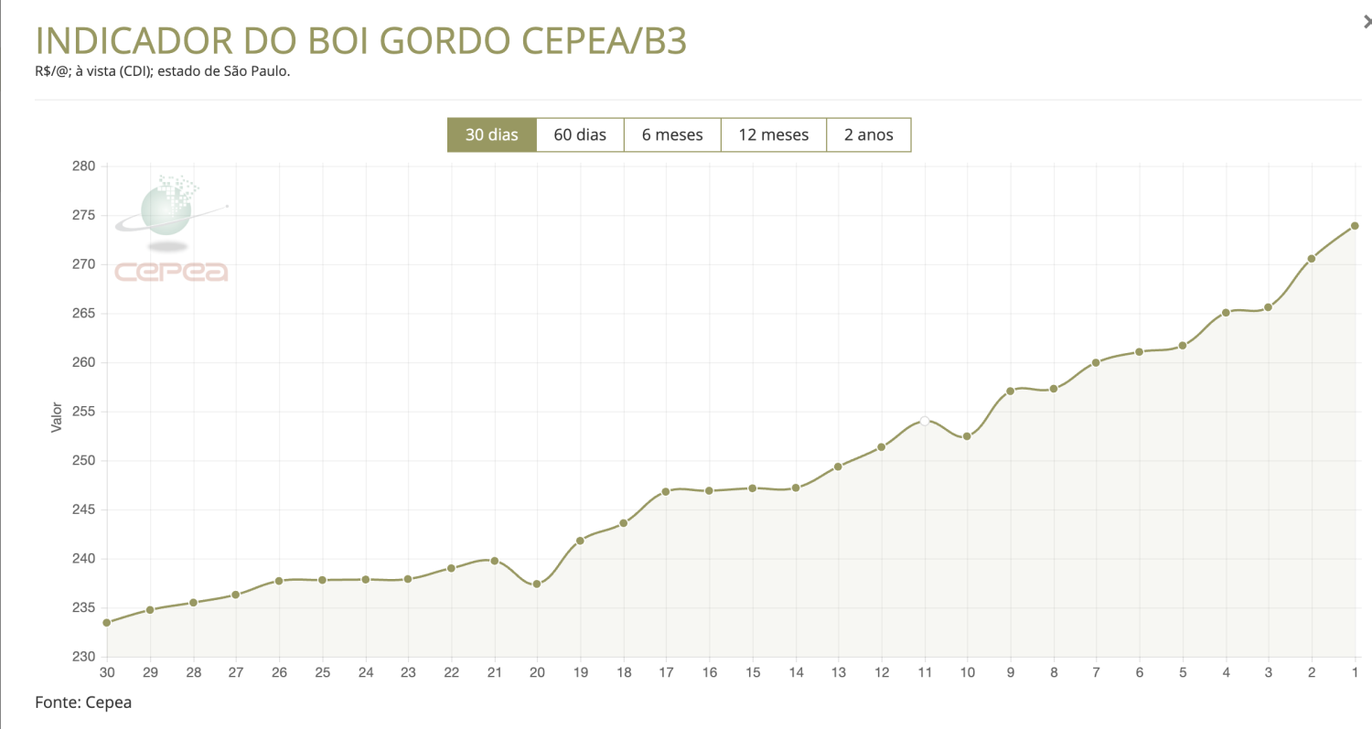 O Indicador do Cepea/B3, fechou a última sexta-feira com uma valorização mensal de 14,24% e, com isso, alcançou o valor de R$ 273,90/@. Conforme o gráfico abaixo, é possível observar a escalada dos preços ao longos dos últimos dias, reflexo dos fatores listados acima.