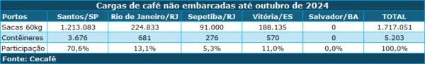 Apesar da exportação recorde do agronegócio brasileiro em outubro de 2024 (US$ 14,27 bilhões), o Brasil acumula 1,717 milhão de sacas de café em 5.203 contêineres parados nos portos. O motivo, segundo o Conselho dos Exportadores de Café do Brasil (Cecafé), é a falta de infraestrutura adequada para cargas conteinerizadas nos portos do país.