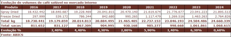 No ano passado, o consumo brasileiro de café solúvel também alcançou seu maior nível na história. O mercado interno absorveu 1,069 milhão de sacas do produto, apresentando um crescimento de 0,6% na comparação com 2023, ano do recorde anterior.