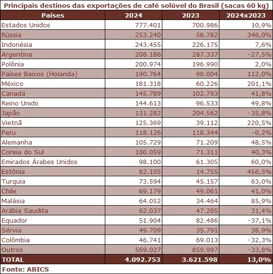 Os Estados Unidos lideraram o ranking dos principais parceiros comerciais dos cafés solúveis do Brasil em 2024 com a importação de 777.401 sacas, o que representou um avanço de 10,9% na comparação com os dados de 2023. Fechando o top 3, aparecem a Rússia, que adquiriu 253.240 sacas do produto (+346%), e a Indonésia, com 243.455 sacas (+7,6%).