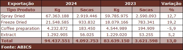 De acordo com a atualização do AbicsData, plataforma da Associação Brasileira da Indústria de Café Solúvel (Abics), as exportações nacionais do produto bateram recorde em 2024, quando foram remetidas o equivalente a 4,093 milhões de sacas ao exterior, o que implicou um crescimento de 13% na comparação com os 3,622 milhões aferidos no ano anterior.