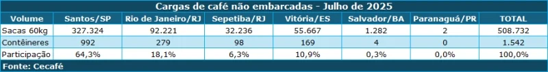 O esgotamento da infraestrutura nos portos do país fez com que o Brasil deixasse de embarcar 508.732 sacas de 60 kg – equivalentes a 1.542 contêineres – de café em julho de 2025, conforme levantamento realizado pela Conselho dos Exportadores de Café do Brasil (Cecafé) junto a seus associados. O não embarque desse volume impediu que o país recebesse US$ 196,05 milhões, ou R$ 1,084 bilhão, como receita cambial em suas transações comerciais apenas em julho deste ano, considerando o preço médio Free on Board (FOB) de exportação de US$ 385,36 por saca (café verde) e a média do dólar de R$ 5,5279 no mês passado.