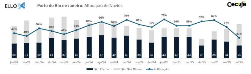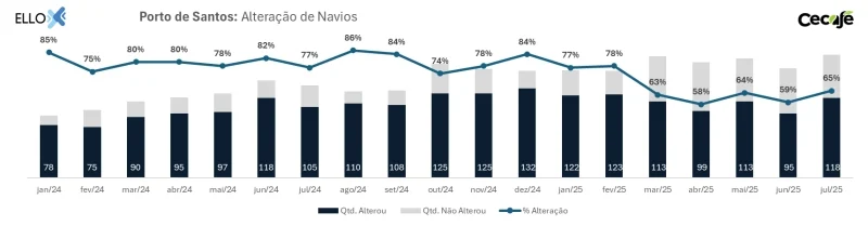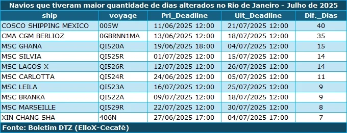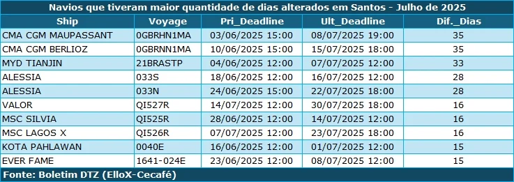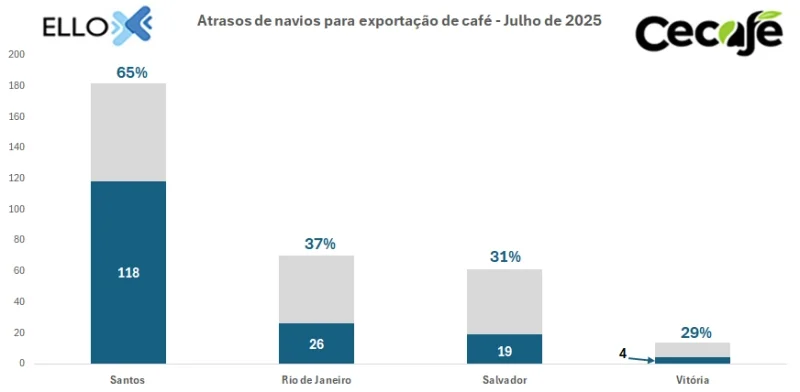 Em julho de 2025, 51% dos navios, ou 167 de um total de 327 embarcações, tiveram atrasos ou alteração de escalas nos principais portos do Brasil, conforme o Boletim Detention Zero (DTZ), elaborado pela startup ElloX Digital em parceria com o Cecafé.