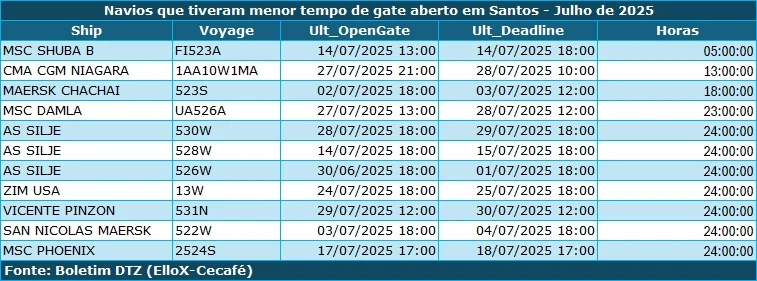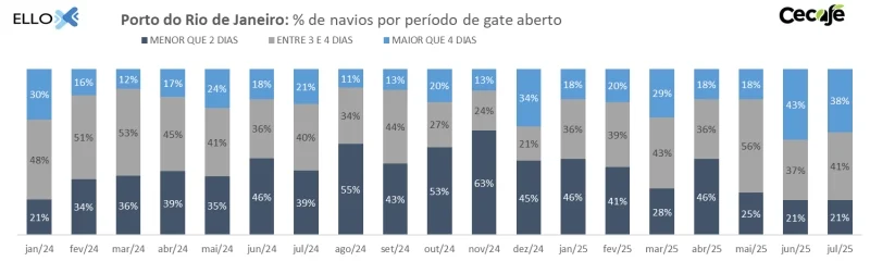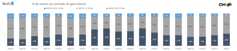 Ainda em julho, apenas 4% dos procedimentos de embarque tiveram prazo maior do que quatro dias de gate aberto por navios no porto santista. Outros 59% possuíram entre três e quatro dias e 38% tiveram menos de dois dias.