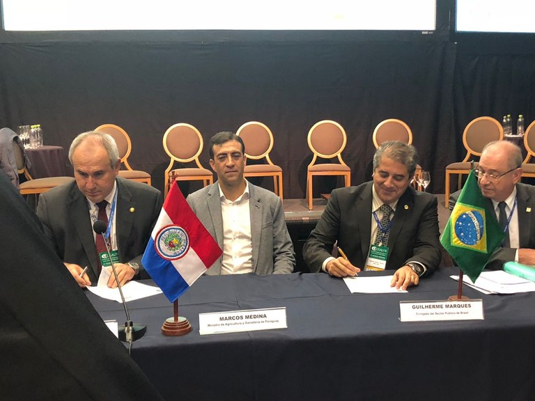O diretor do Departamento de Saúde Animal (DSA) do Ministério da Agricultura, Pecuária e Abastecimento, Guilherme Marques, e o presidente do Serviço Nacional de Qualidade e Saúde Animal (SENACSA) do Paraguai, Hugo Frederico Benitez, assinaram acordo de simplificação do comércio de bovinos entre os dois países.