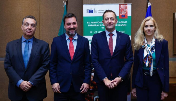 Nesta quinta-feira (23), o secretário de Comércio e Relações Internacionais, Luís Rua, e o comissário europeu para Agricultura, Christophe Hansen realizaram uma reunião de alto nível, em São Paulo. O encontro contou ainda com a presença do diretor do Departamento de Negociações Não-Tarifárias e de Sustentabilidade do Mapa, Augusto Billi, da embaixadora da União Europeia no Brasil, Marian Schuegraf, e de representantes da Comissão Europeia.