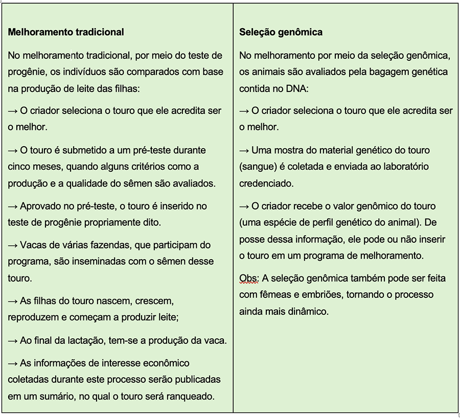O quadro abaixo compara os dois modelos de melhoramento: o tradicional (antes da avaliação genômica) e como a seleção genômica otimizou o processo: