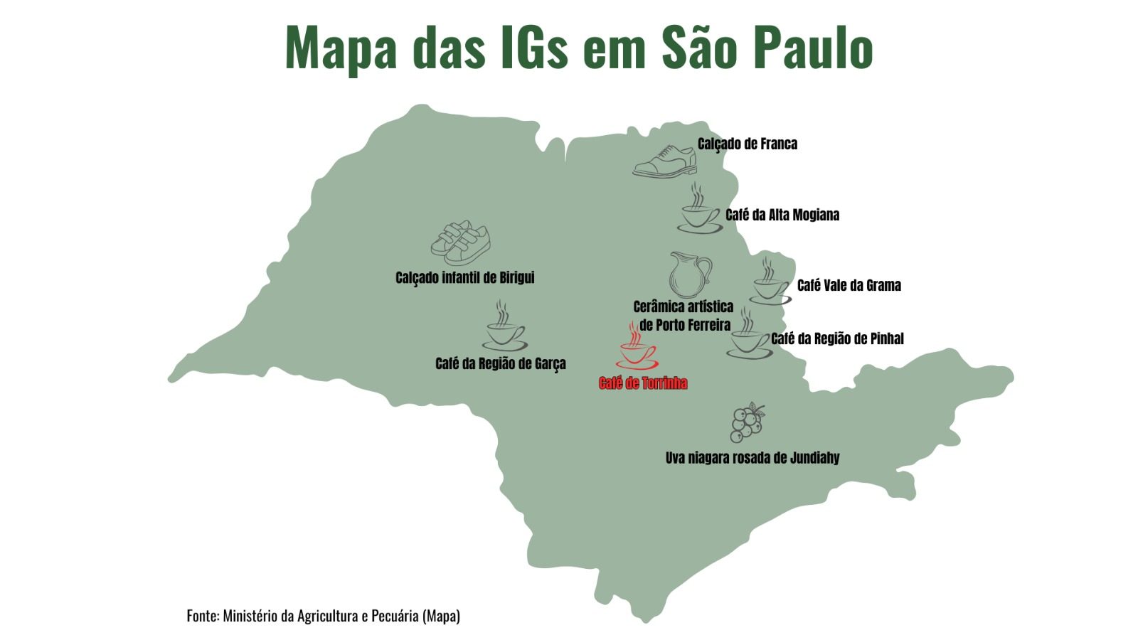 O Estado de São Paulo tem hoje nove produtos com a IG reconhecida: o café da Alta Mogiana, o calçado de Franca, o café da região de Pinhal, a cerâmica artística de Porto Ferreira, o café da região de Garça, o calçado infantil de Birigui, a uva niagara rosada de Jundiahy, o café do Vale da Grama e, agora, o café de Torrinha.